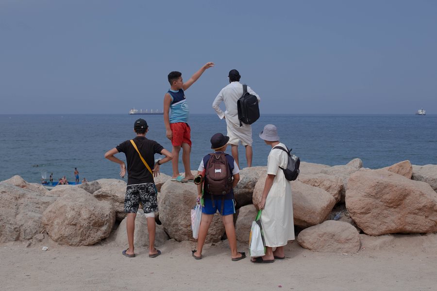 A Moroccan family swims right on the sea border between Morocco and Algeria, 2025.