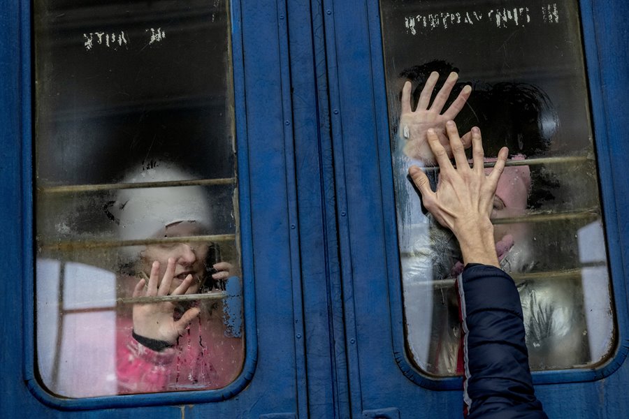 Photo: Oksana Gonishuk and her children Any (9) and Illa (13) say farewell to their husband and father Yevgeni Gonishuk in the train station in Lviv, Ukraine, on 6 March 2022. Under martial law, men aged 18 to 60 are not allowed to leave Ukraine. They're expected to fight. The family fled their home in Kharkiv, where the fighting was worsening everyday and is now heading for safety in Poland. By Mads Nissen, Politiken, World Press Photo of the Year winner in 2021.