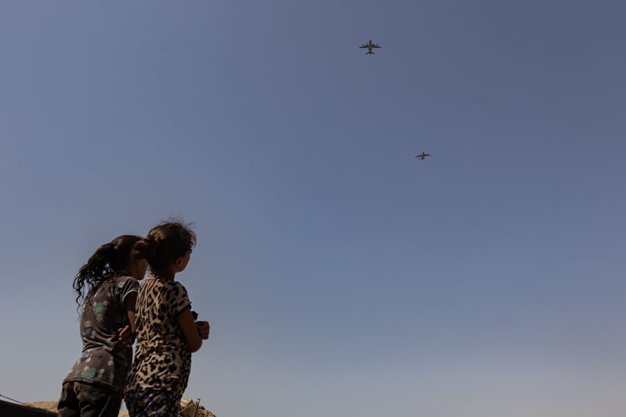 An aircraft drops aid over various areas of Gaza City, with the participation of several Arab and Western countries, on 14 August 2025. For the New York Times.