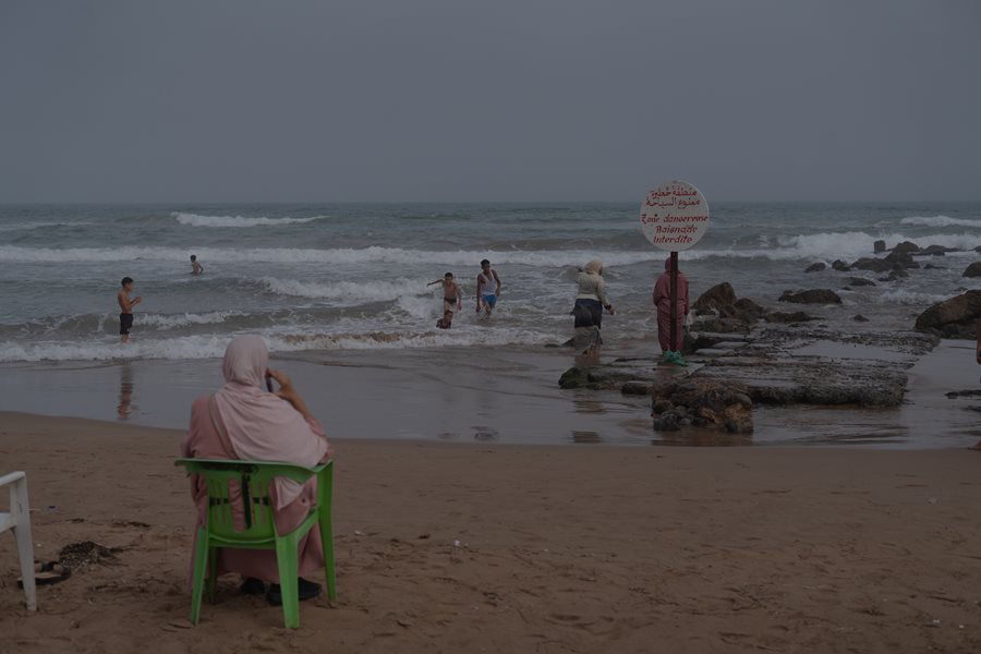 A Moroccan family swims right on the sea border between Morocco and Algeria, 2025.