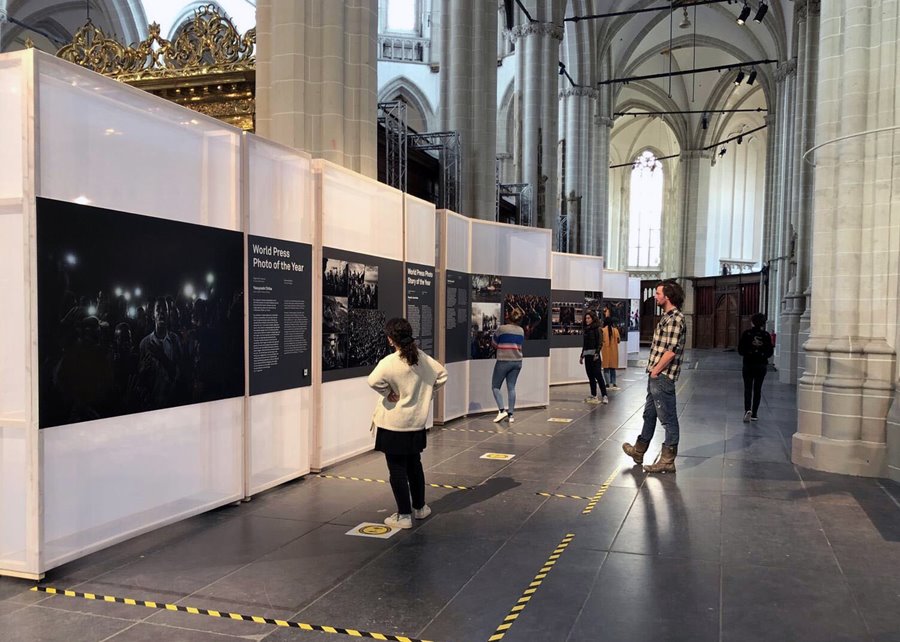 The design of the Flagship World Press Photo Exhibition 2020 in De Nieuwe Kerk in Amsterdam, the Netherlands, has been adjusted to follow safety distancing measures. © Jerzy Brinkhof.