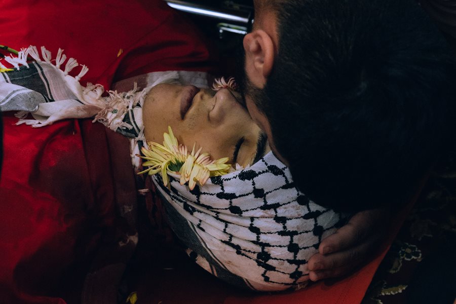 Members of Ahmad Mutair’s (17) family bid him farewell before he was laid to rest in 2023. Earlier that day, dozens of Israeli forces entered Qalandia camp in an early morning raid. Ahmad was standing on his roof when an Israeli sniper shot a bullet that went through his chest. Ahmad was a fourth- generation refugee. After he was shot, his family spent over 30 minutes trying to take him to a nearby hospital outside Qalandia refugee camp. Israeli forces did not allow Ahmad’s family to leave. Eventually they found an ambulance on the outskirts of the camp which took Ahmad’s body to the Ramallah hospital, where he was pronounced dead.