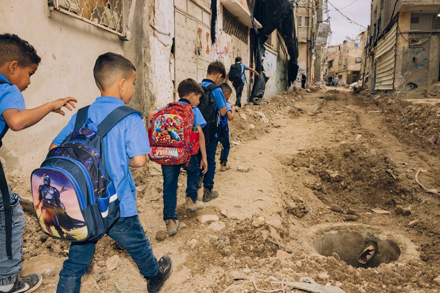 Children walk home after school on the destroyed streets of Tulkarem refugee camp in Palestine, on 1 October 2024. The destruction followed Israel’s siege of the camp, after two years of escalating colonial violence. The camp has since been completely depopulated and ethnically cleansed. Today, the Israeli army uses it to train soldiers before entering Gaza.