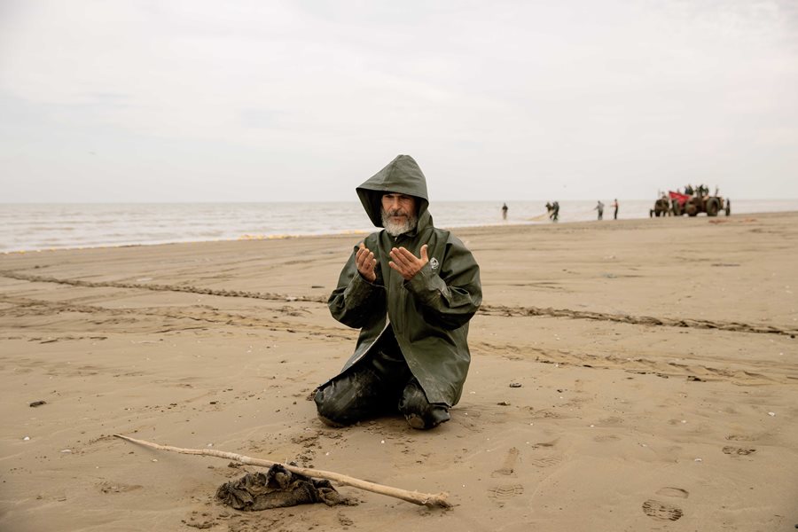 A fisherman prays, thanking God for his catch after several days without success. Mazandaran, Iran, 12 January 2024