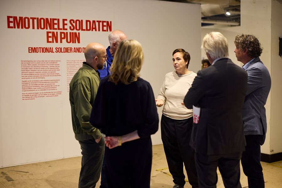 Left: Speakers, staff members, and visitors at our 70th anniversary exhibition,‘What Have We Done?’ , in Groningen, the Netherlands. Right: Curator, Cristina de Middel, at the opening of the exhibition in the Netherlands. Credit: Tim Van Der Kuip.