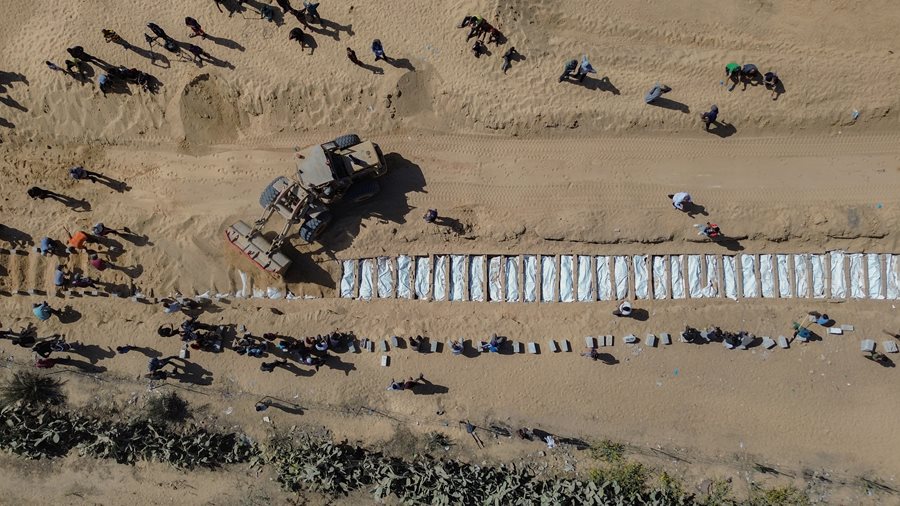 Civil defense crews bury the bodies of 54 martyrs in a mass grave after they were released from Israeli prisons. South of Deir al-Balah, 22 October 2025. For the New York Times.