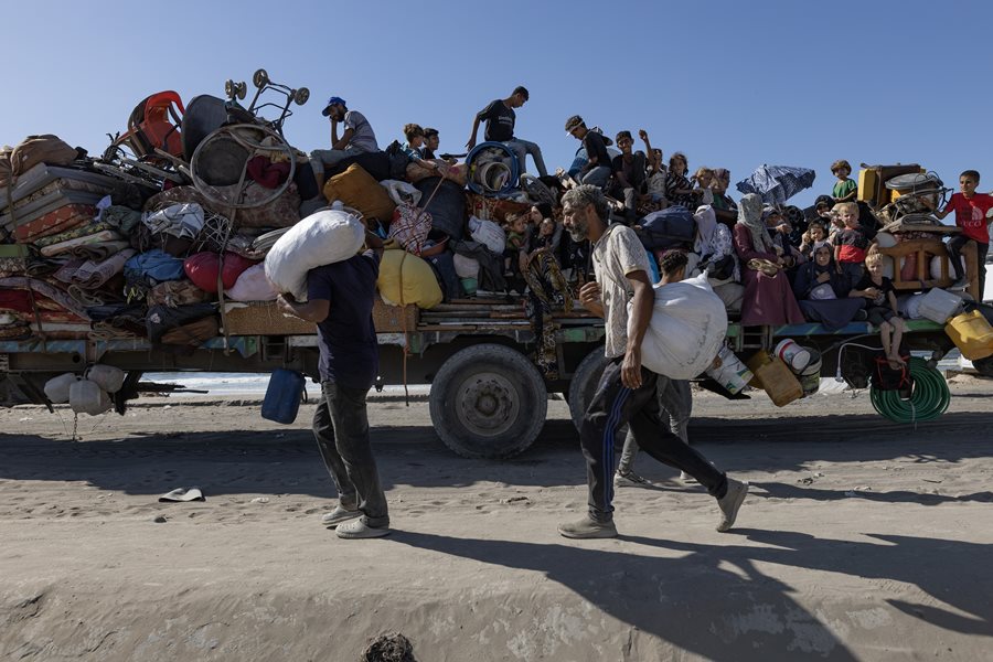 Palestinian families continue to flee Gaza City via Rashid Street in the western Gaza Strip. The army issued a statement announcing the start of its military operation in Gaza City. West of Nuseirat camp, Palestine, 16 September 2025. For the New York Times.